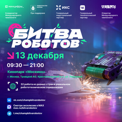 Четыре отборочных этапа Чемпионата прошли на территории Пермского края, Московской, Ленинградской и Свердловской областей. В них приняли участие 112 команд со всего мира, из них только 32 команды встретятся в финальном этапе, чтобы побороться за титул чемпиона битвы роботов 2025 года. На текущий момент прямую трансляцию этапов посмотрели более 20 млн человек, свыше 20 000 человек посетили отборочные этапы. В финальном этапе Чемпионата сразятся 32 команды из 10 регионов России, а также из Индии, Китая, Туниса, Бразилии и Ирана. Мероприятие пройдет 13 декабря 2025 года с 09:30 до 21:00 (по московскому времени) при поддержке Правительства Москвы на территории кинопарка «Москино» по адресу: г. Москва, Троицкий административный округ, Краснопахорский район, улица Лиозновой. Программой мероприятия предусмотрено три шоу поединков битвы роботов в категории до 110 килограмм и мини-роботов до 1,5 килограмм. Не пропустите прямую трансляцию Чемпионата. Поддержите любимые команды! | |